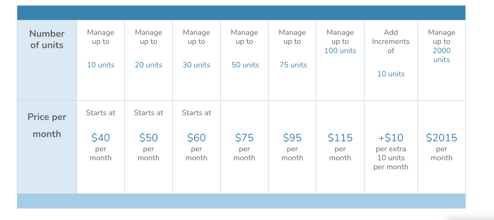 This model is simple. You’re charged a small amount for each unit you manage. It’s the kind of pricing that scales directly with your portfolio size, which makes it easy to predict but also easy to underestimate when you start growing fast.